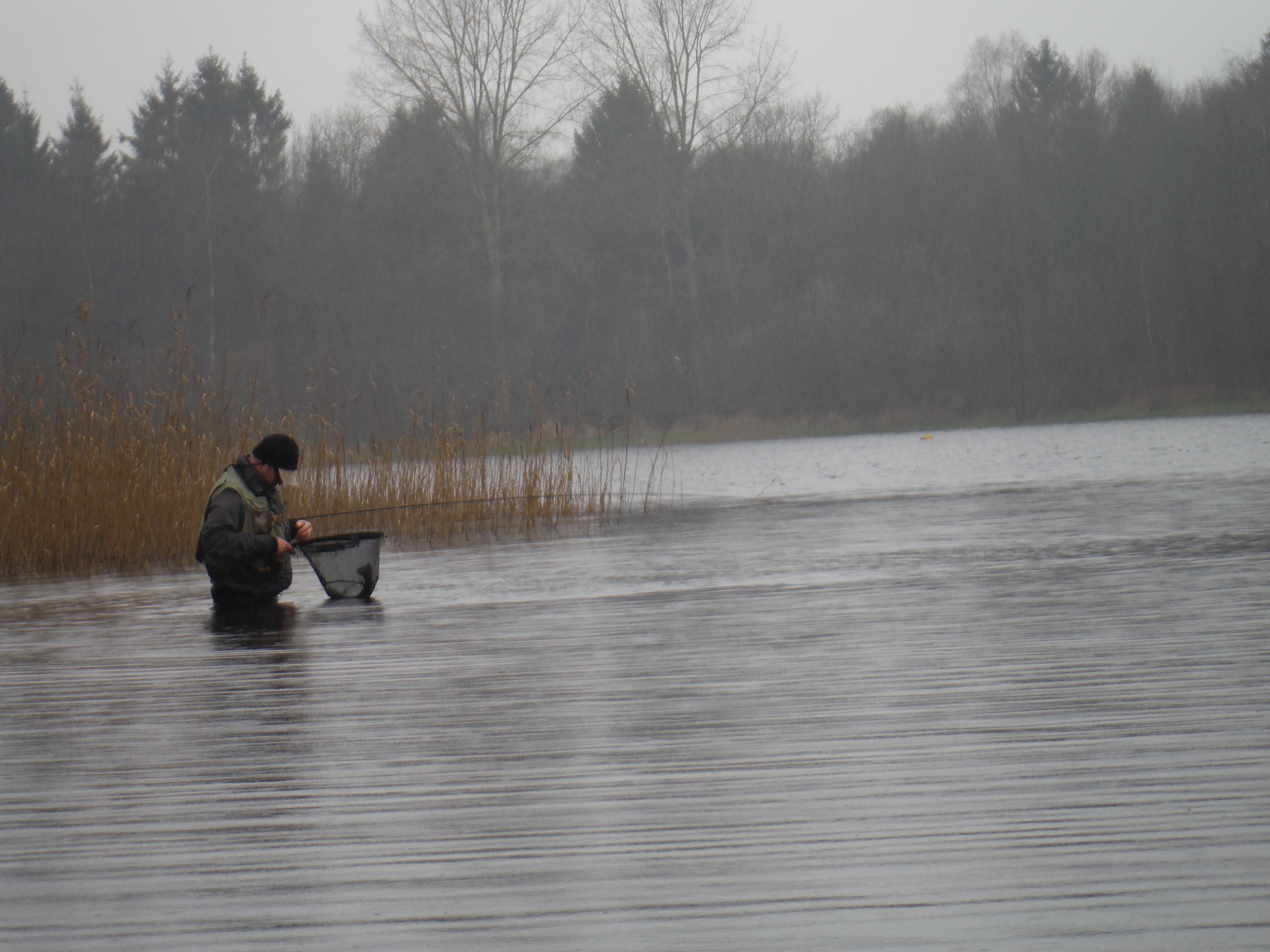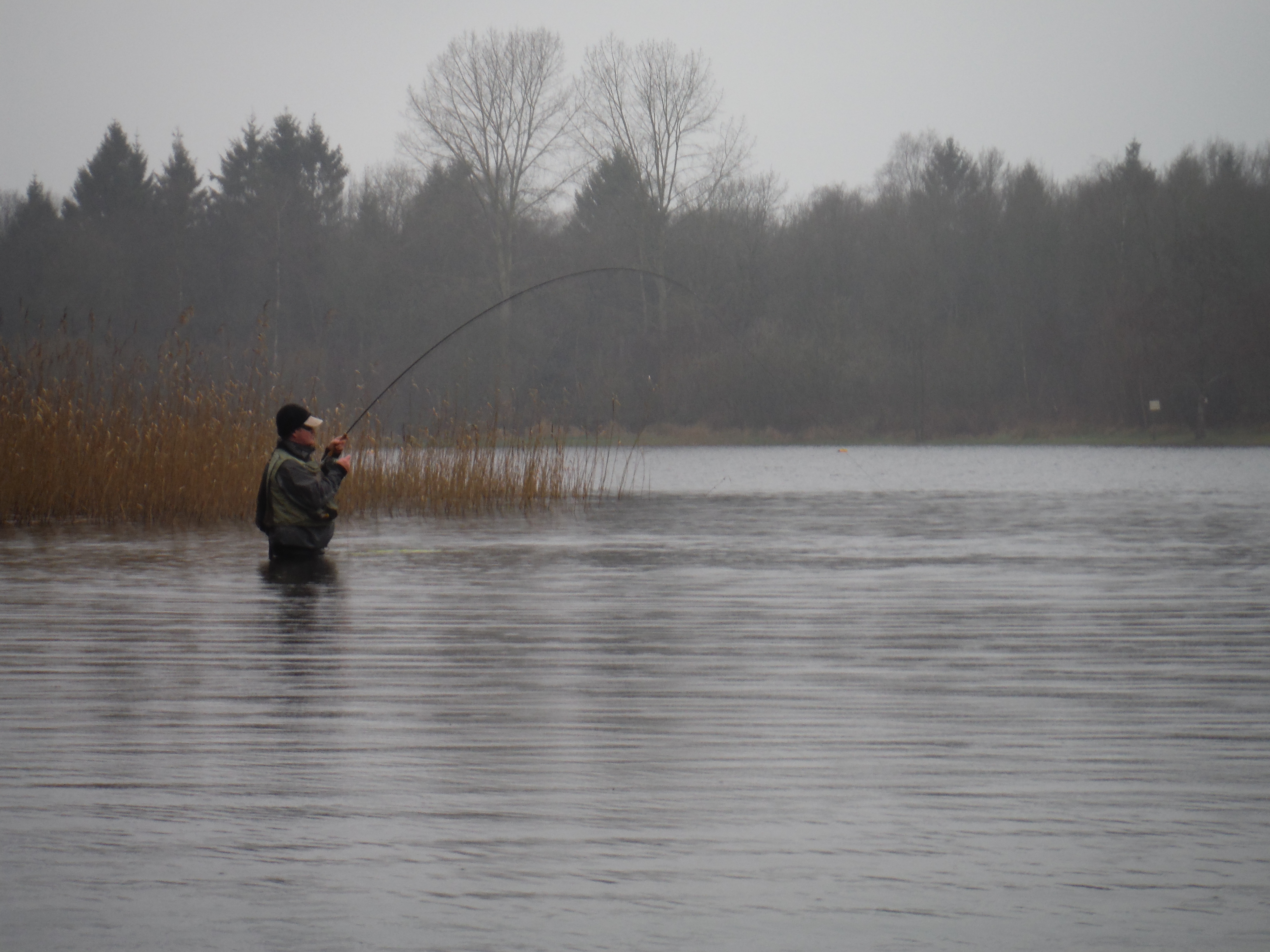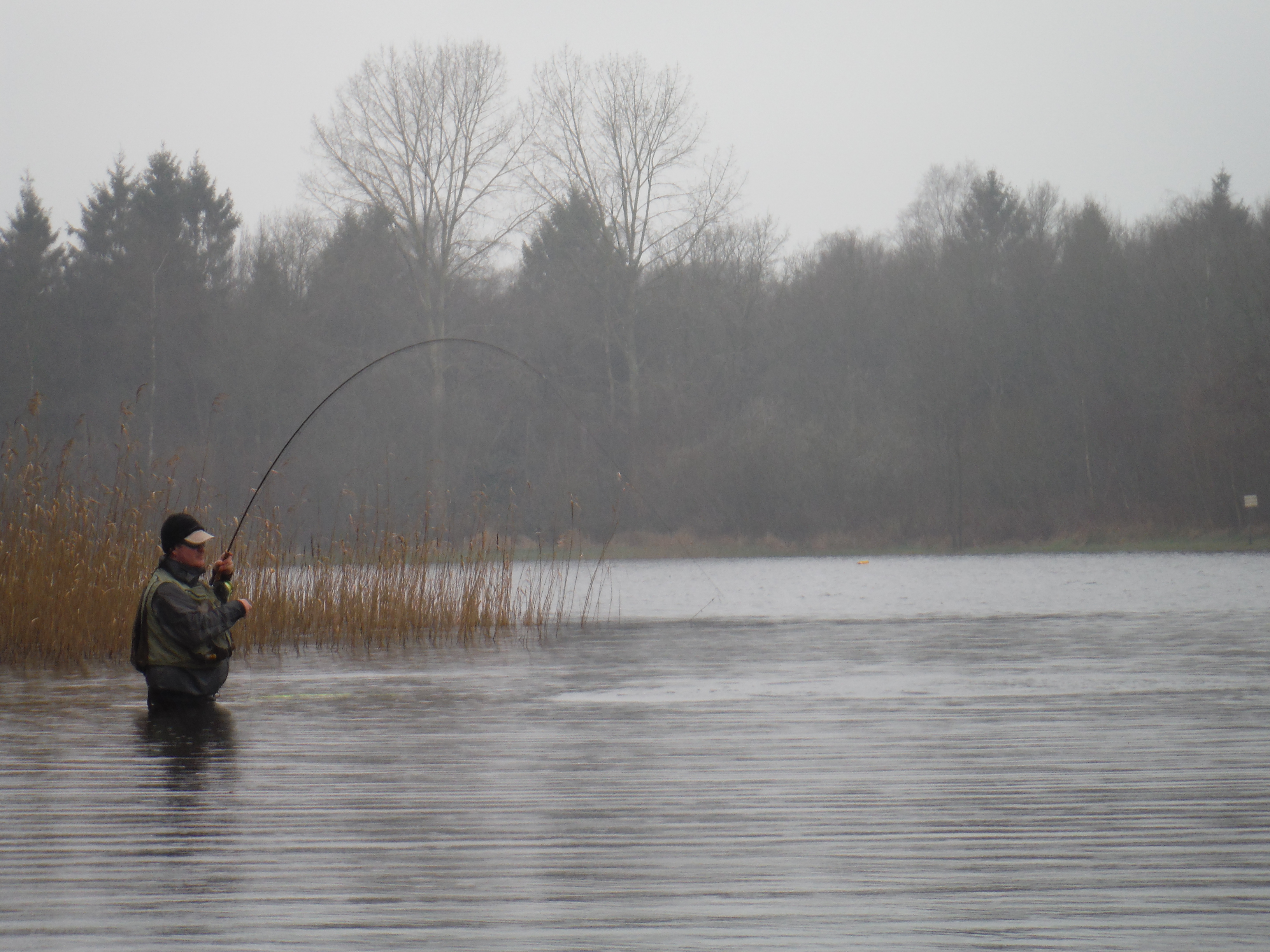 Rond de middag begon het te motregenen en dat is niet meer opgehouden en af en toe regende het zachtjes. Maar ook nu stonden de hengels krom van mooie sterke vissen.