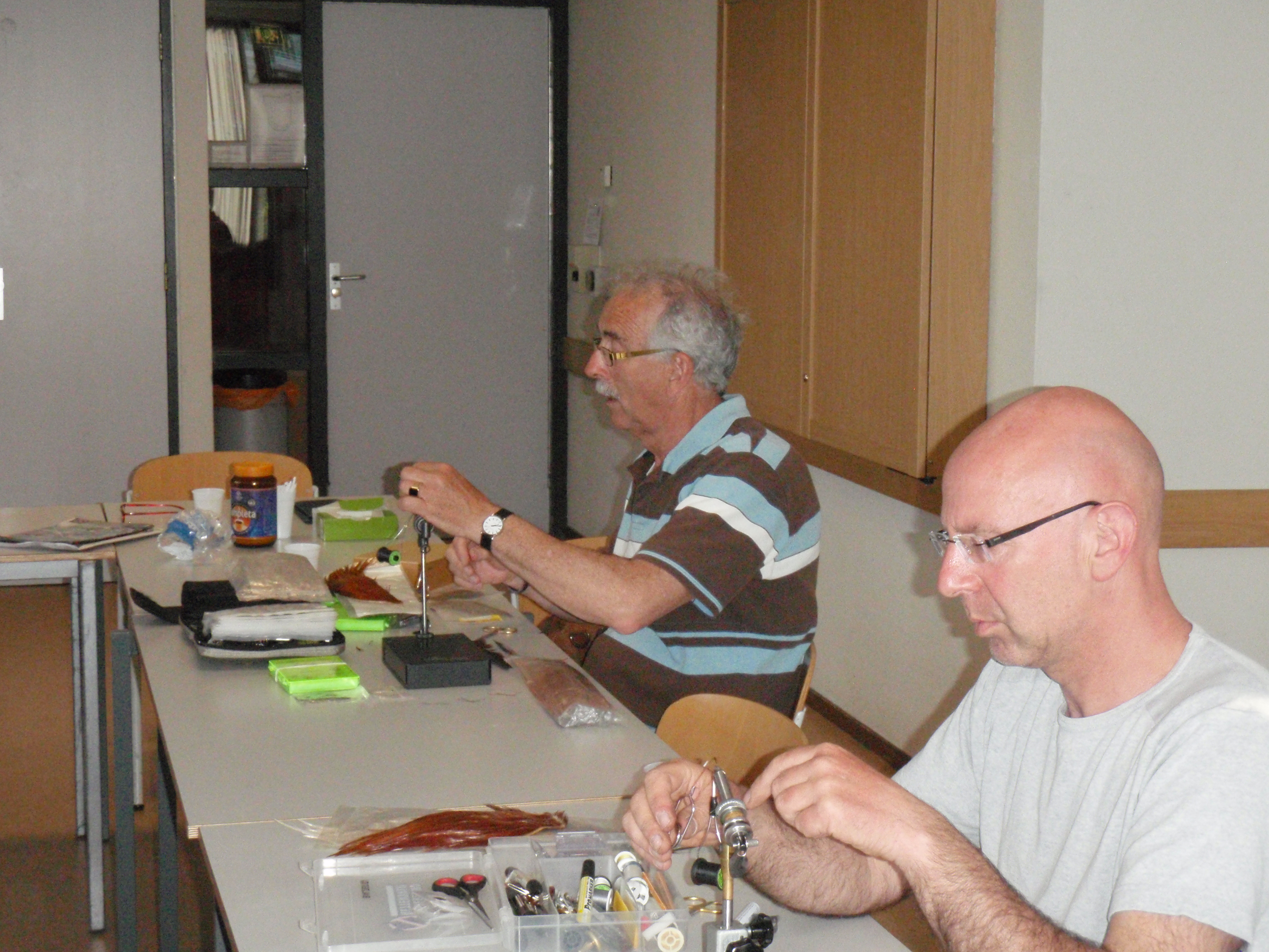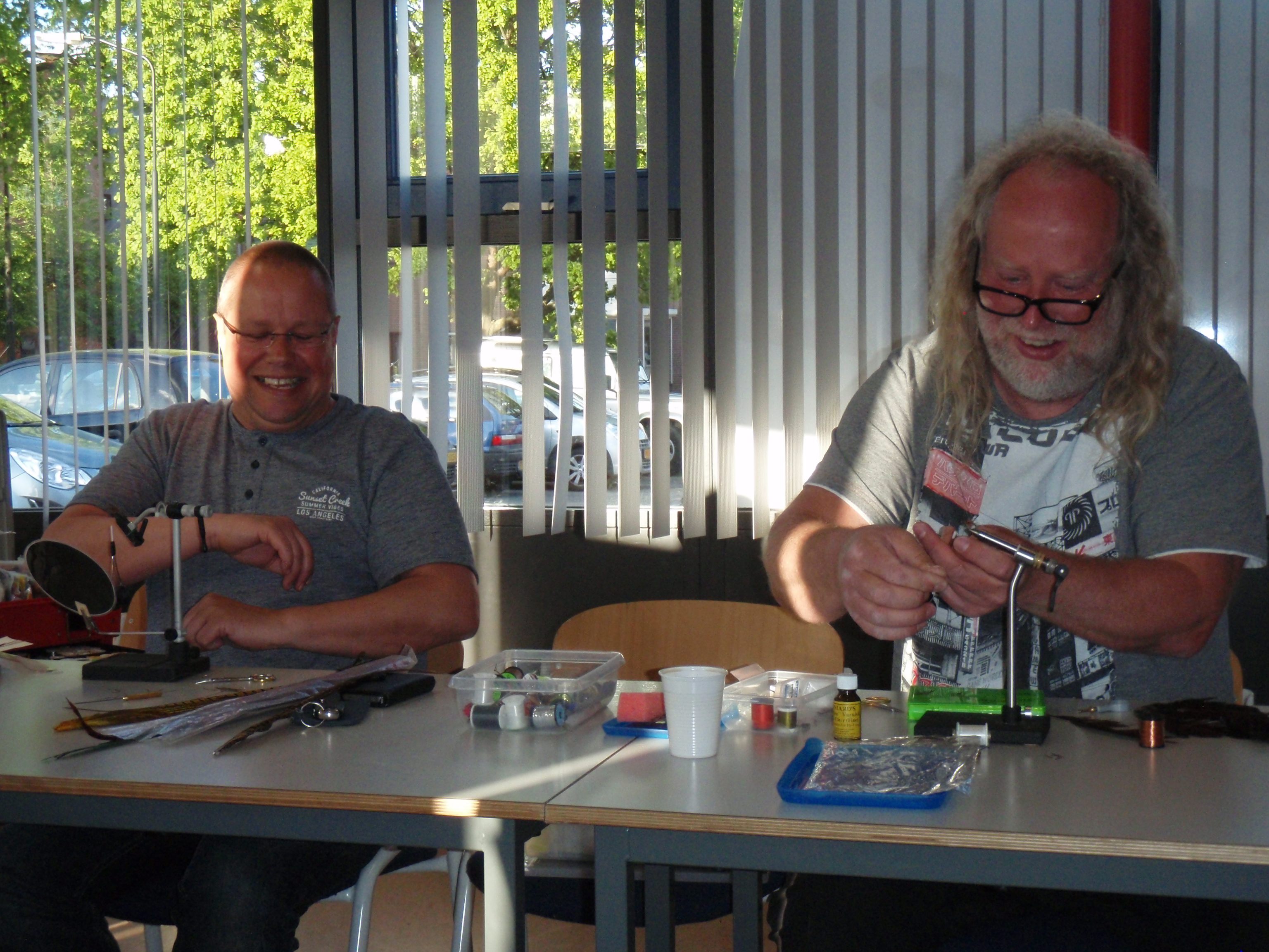Er was weer voldoende animo voor de bindavond. Na het bespreken van de eerste stappen en het op rij leggen van de materialen voor deze vlieg kon een ieder aan de slag. Er is nog een verwijzing naar You Tube “Tying the Daddy/Snatcher by Davie McPhail.