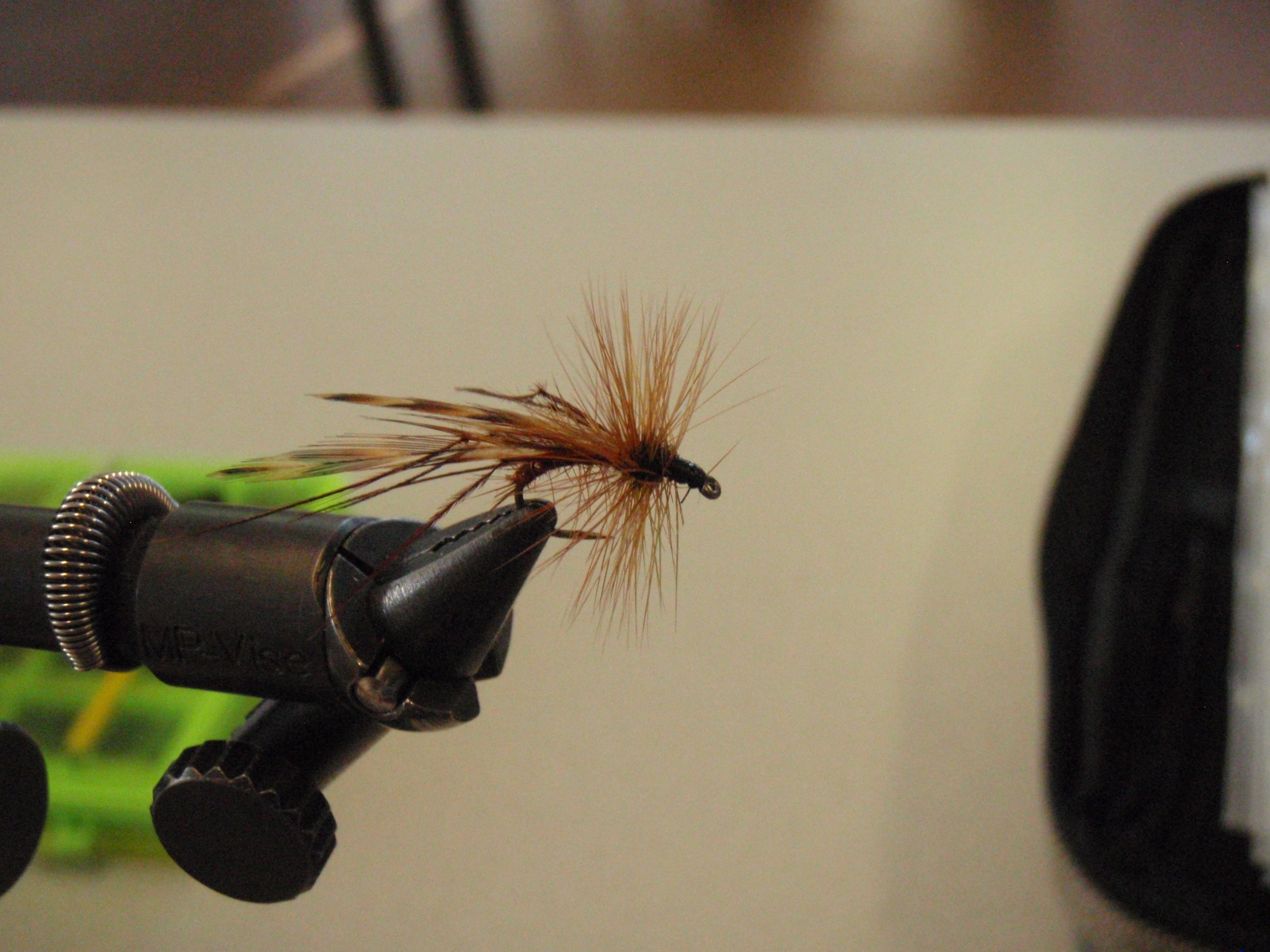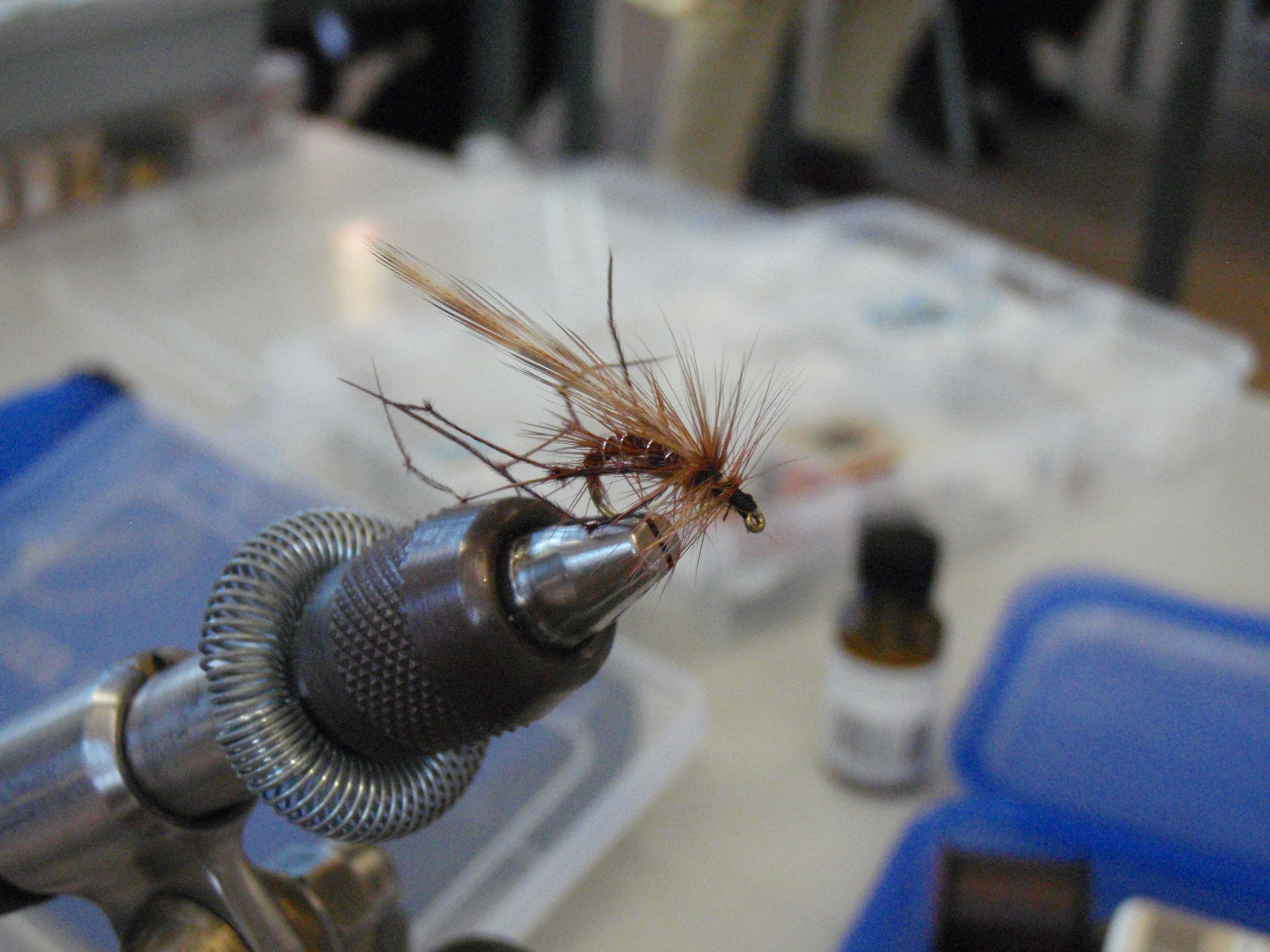 Het tweede patroon was de F Fly. Hier zijn er ook enkele van gebonden. Gedurende de avond zijn er geen foto’s van gemaakt. Het is een patroon dat al door velen gebonden is. Vanavond is de methode gebruikt om de CDC veer met de stamp richting de haakbocht in te binden en daar na de vleugel terug te binden over het niet te kort afgeknipte rest van de CDC veer, hierdoor blijft de vleugel beter omhoog staan.