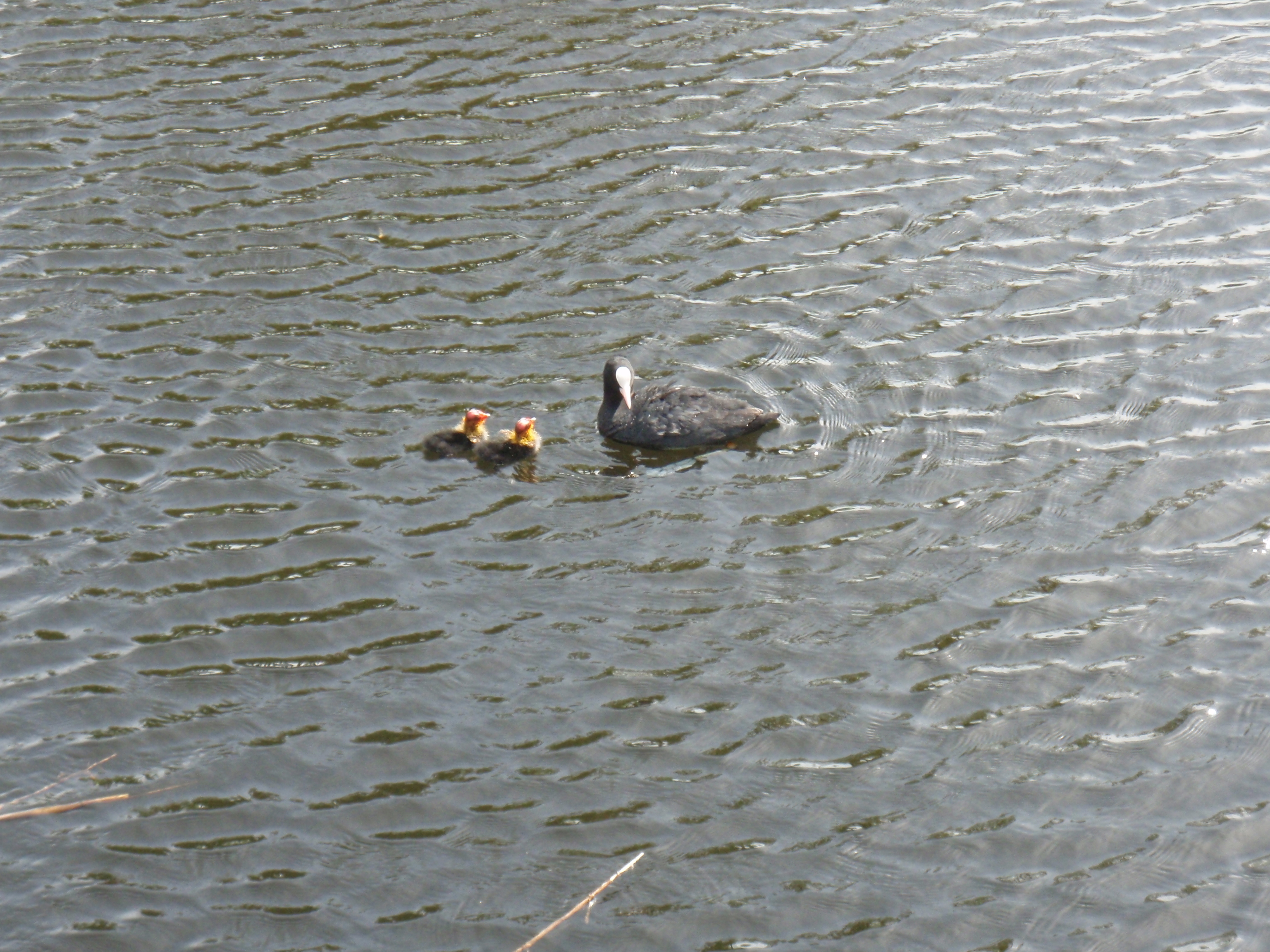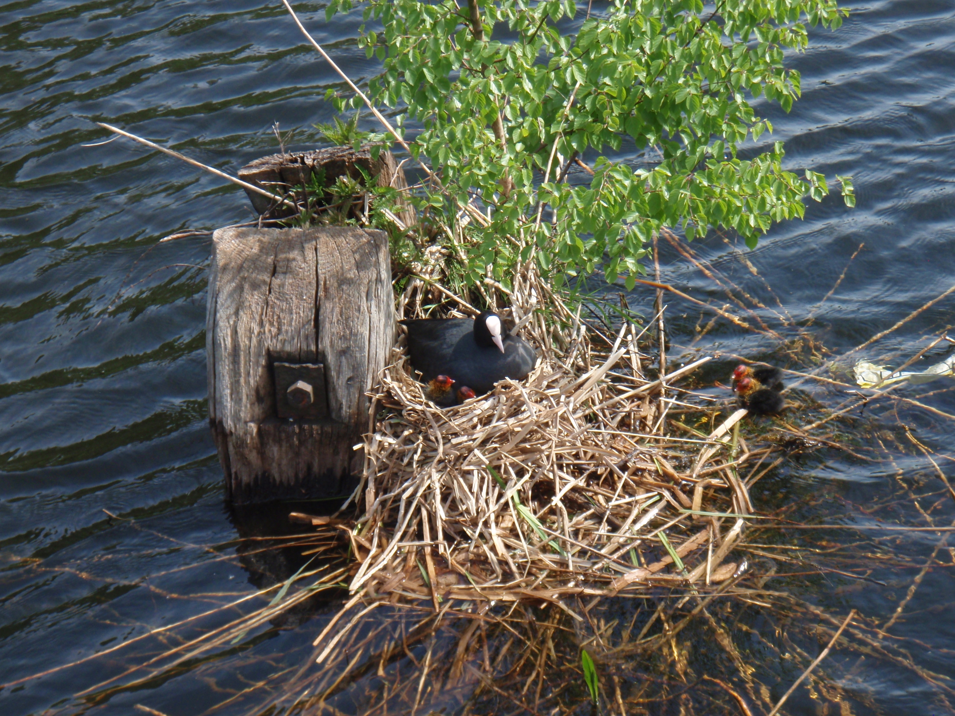 Een volgende dag zie je ineens jong leven op het kanaal, tegen een verrotte steunpaal bij een brug heeft de meerkoet een nest gemaakt en met succes, getuige de jongen.