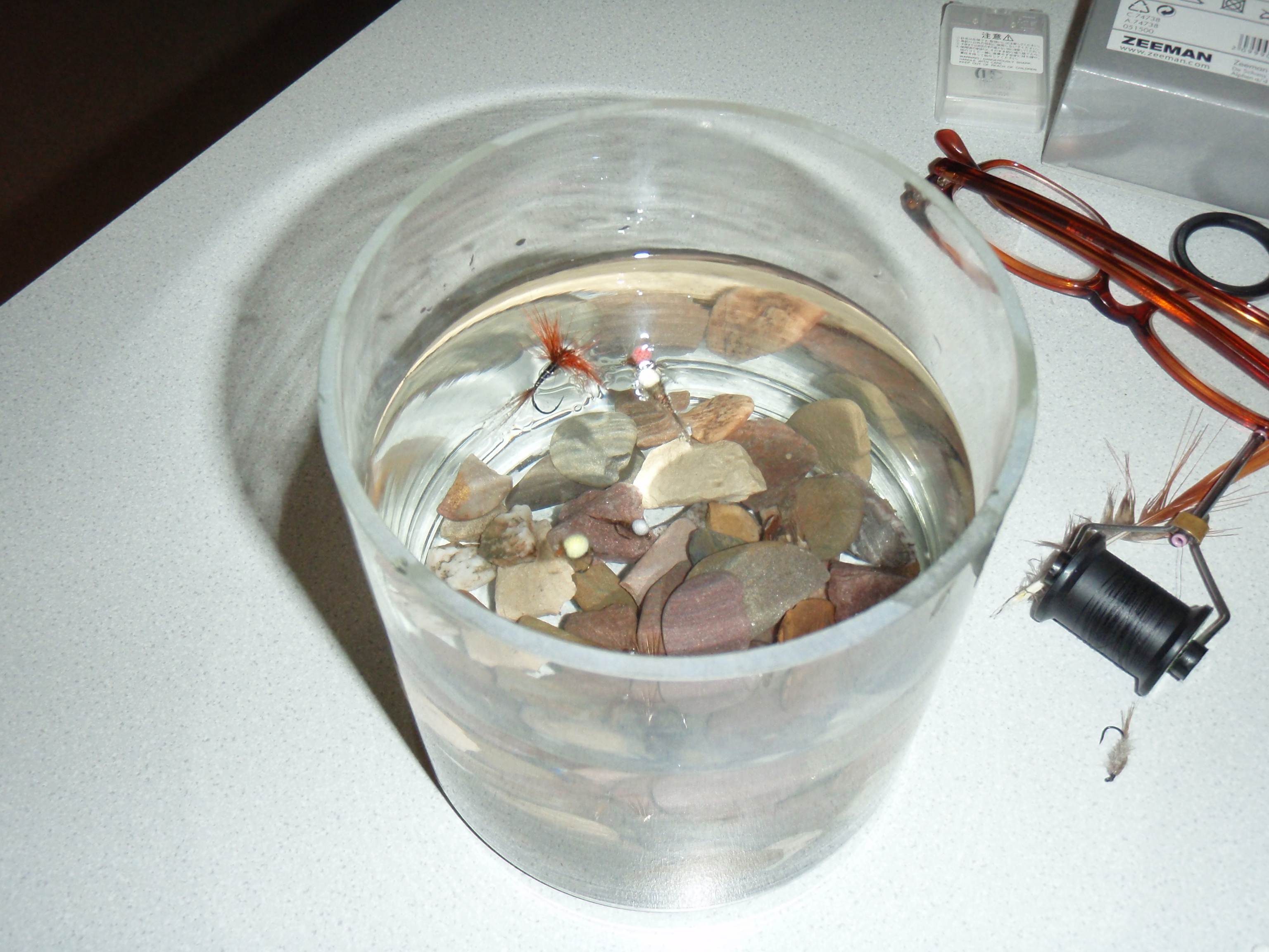 Genoeg gepraat we gaan ze binden. Haakmaat 14-16 in de vice, zwart of bruin binddraad, piepschuim bolletje in een stukje nylon sok (van de Zeeman), enkele fibers van CDC, patrijs of fazant als staartje. Een lijfje van 2-4 fibers van een goudfazantenstaart en een beetje hazen of konijnen dubbing rond het bolletje en klaar is de emerger voor zijn eerste duik in Piet’s proefvijver.
