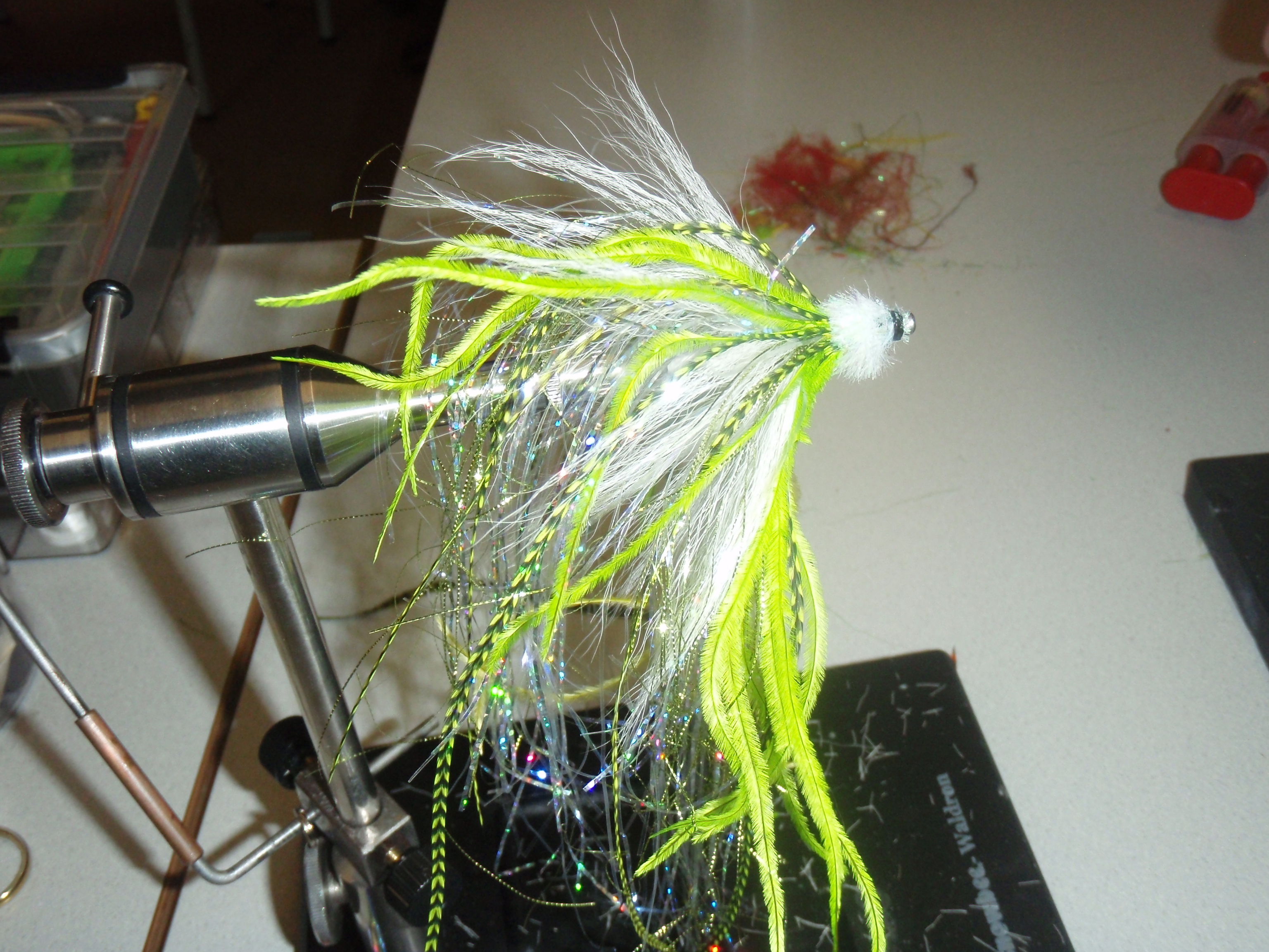 Tube in de vice glitter, bucktail nog weer glitter en vooral met secondelijm vastzetten, struisveertjes en nog wat rood haar en toen een kopje maken met 2 componentenlijm. Het gebruik van de haarklem, ook gebruikt bij orchideeën, kwam erg goed van pas.
